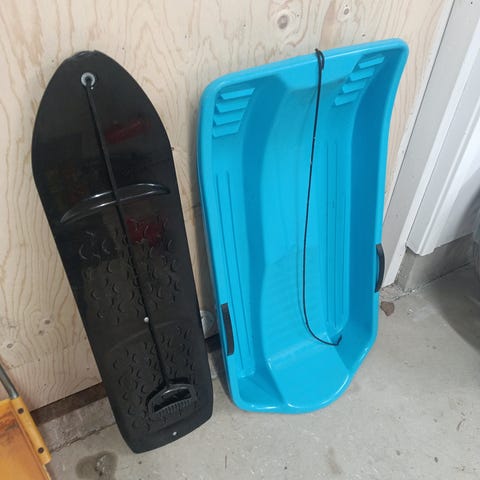 Pulkka, liukereita, lumilauta ja lumipotkulauta. Käytön jälkeä löytyy, etenkin liukureissa. Muuten hyväs kunnossa.