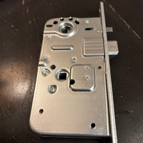 Käyttämätön, uuden oven mukana tullut LC102 lukkorunko. Lukko on tällä hetkellä vasenkätisenä.