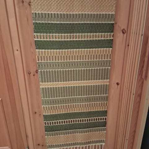 Kukkakuvioinen punainen villasta tehty seinävaate. Pidike kuuluu hintaan.