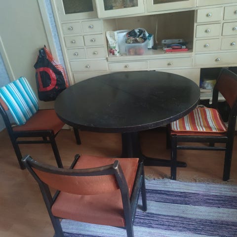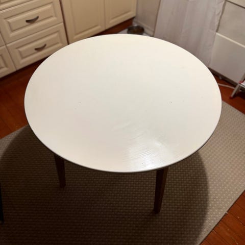 Myydään Jyskistä kaksi vuotta sitten ostettu pyöreä ruokapöytä. Jalat maalattu valkoiseksi. Pöytä siistissä kunnossa, pieniä naarmuja reunoilla (viimeinen kuva)