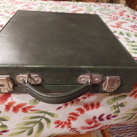 Vanha ruskea salkku. Leveys 38 cm. Korkeus 29 cm.