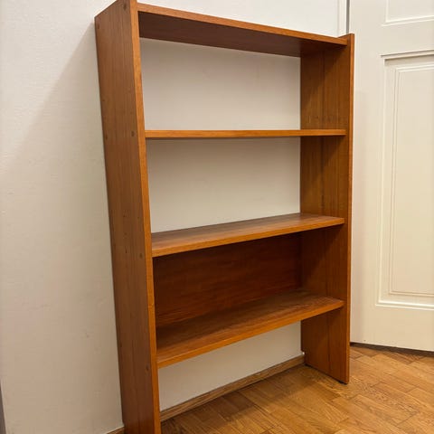 Kaunis tiikkihylly. Käytössä tullut kulumaa ja takalevy hieman repsottaa. Kuvissa pahimmat naarmut, itseäni ei ole haitannut. Nouto Kannelmäestä.