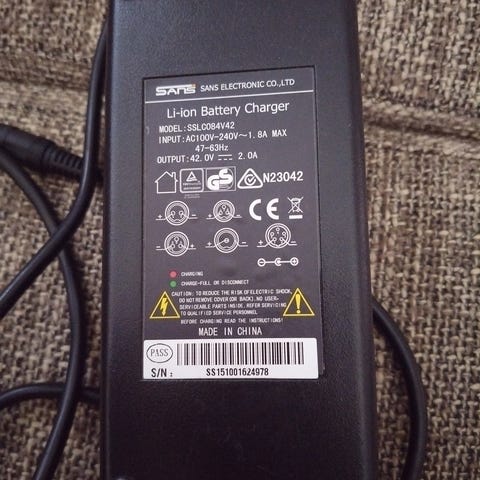 Akku, latauspistoke ja telakka toimii, mukana tulee myös avain. Telakan johdot telakan sisällä, liittimen joudut tehdä itse. Laturi 50€ lisähinnasta mukaan.