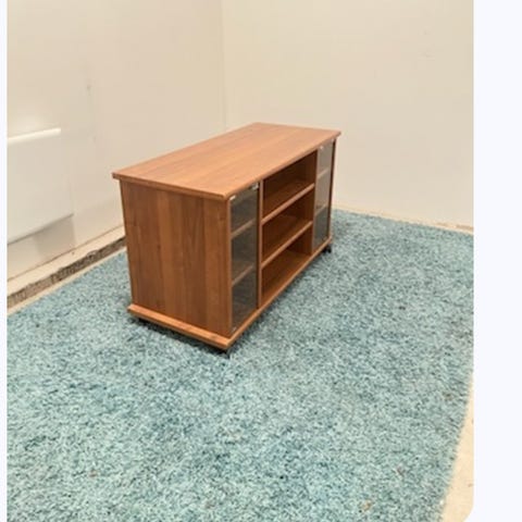 Seinään kiinnitettävä tammenvärinen TV taso mustalla liukuovella. Elämää nähnyt ja käytön jälkiä on. Joskus ollut mustat jalat, mutta rikkoutuessaan menivät roskiin. Haku hirvaskankaalta tai kulkeutuu Jyväskylään omien menojen mukana.