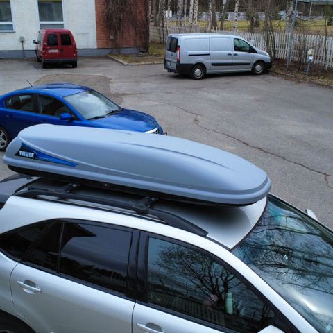 Löytyy kattokaiteisiin sopivat Thulen telineet. Kaksi mallia.
