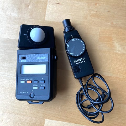 Laite on löytynyt vintiltä, enkä ole itse käyttänyt sitä. Toimii 9V paristolla. Laite on testattu, ja mittaukset eri pinnoilta ja valonlähteistä näkyvät näytöllä ja etsimessä.