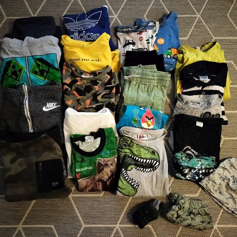 Kolme kassillista vaatteita, 128cm: