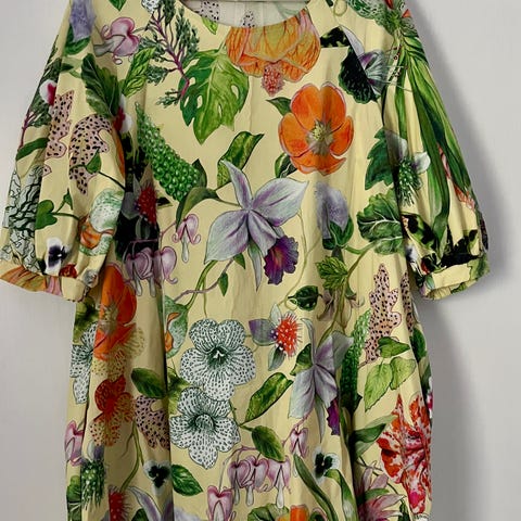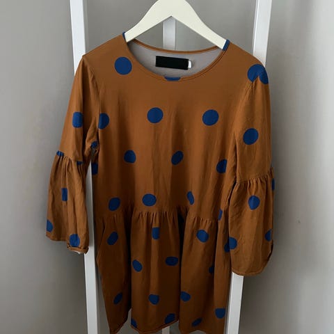 Vimma mekko. Sivuilla taskut. 100% viskoosia. Ihanan kevyt päällä. Kunto hyvä ja siisti. Jonkin verran joissain kohdissa pintanukkaa ja pienen pieni langanveto (ei kiristävä, vaan sellainen hento viiru). Koko M/L.