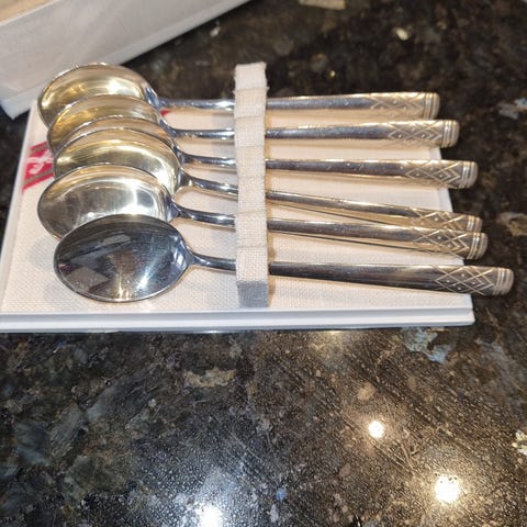 3kpl hopeisia Aino veitsiä ja 3kpl haarukoita. Käyttämättömiä, jokaisessa kaiverrus AJ. Yht. 800€.