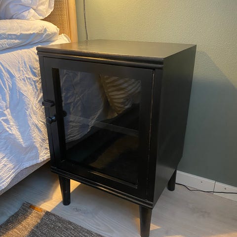 Kaksi mustaa yöpöytää lasikannella.