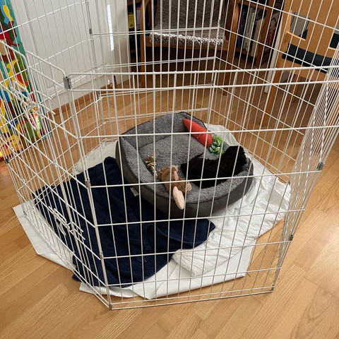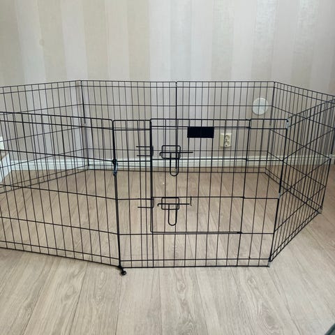 Päälle vuosi sitten ostettu pentuaitaus, joka koostuu 8 aitaelementistä. Kiinnittyy erilaisiin muotoihin 3 pistolukolla. Ostettu alunperin puuilosta.