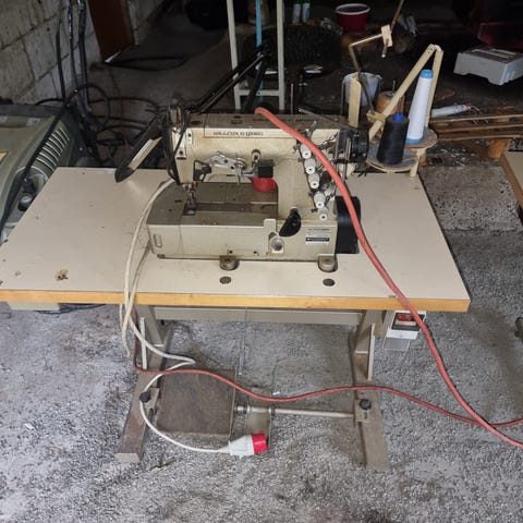 Durkopp teollinen ompelukone singer pöydällä. Raskas metallirunkoinen kone, joka on kiinnitetty puiseen ompelupöytään valurautaisella jalustalla. Jalustassa on poljinmekanismi ja pöydän alla sähkömoottori hihnakäytöllä. Koneessa on suoraommel ja teollisuustyyppinen paininjalka, soveltuu paksummillekin materiaaleille. Kokonaisuuteen kuuluu kone, pöytä, jalusta ja moottori näkyvine johtoineen. Voima virta moottori helppo päivittää valovirta moottorilla.. ite olen pyörittänyt käsin ku ommellut menee miltei sentin nahkaan ku kusi lumeen.