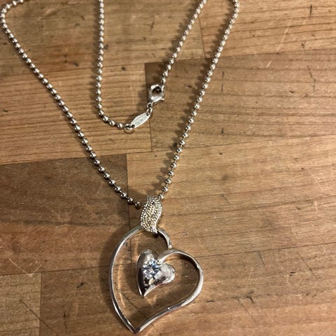 Tiffany hopeakaulaketju, pit. 49 cm, lev.9 mm, paino 77,6g, Sydänlaatta jossa teksti ja leima, myös lukossa leima. H. 200€ +pk paketti.
