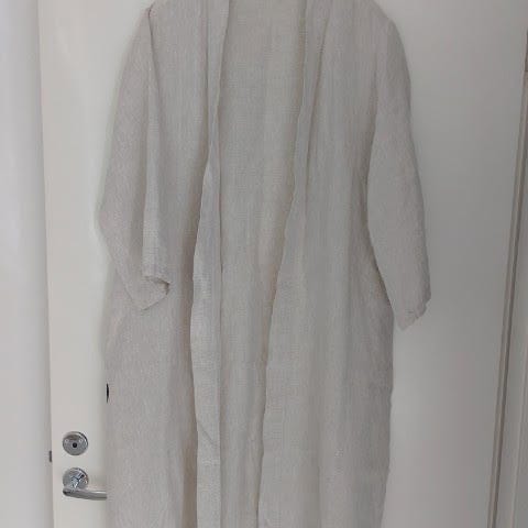 Valkoinen hieman pidempää mallia oleva pellevatakki. Koko 42. Vastaa noin kokoa L. Laadukasta eurooppalaista pellavaa. Sisällä ohut vuori ja olkatoppaukset. Solmittava pellavavyö. Painonapit ja kaulukset. Kunto on todella hyvä ja siisti. Valitettavasti hieman vaan ryppyinen kuvissa.