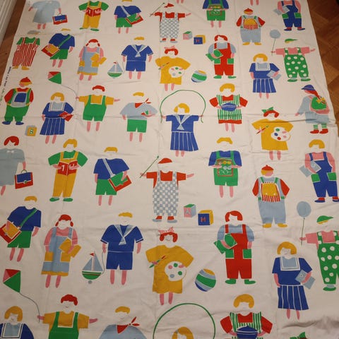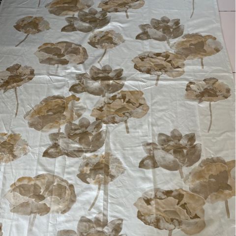 2 x täysipitkää verhoa ja yksi kappa, joko ikkunaan tai ompelukankaaksi. Kankaan leikkausreunat on käännetty liimanauhalla. Verhot on pesty.