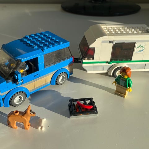 LEGO City #60117 Asuntovaunuyhdistelmä. Kaikki osat ja ohjeet tallessa, hyvässä kunnossa, ei jälkiä. Setti sisältää auton, asuntovaunun, grillin, kaksi henkilöä, koiran ja paljon muuta rekvisiittaa.