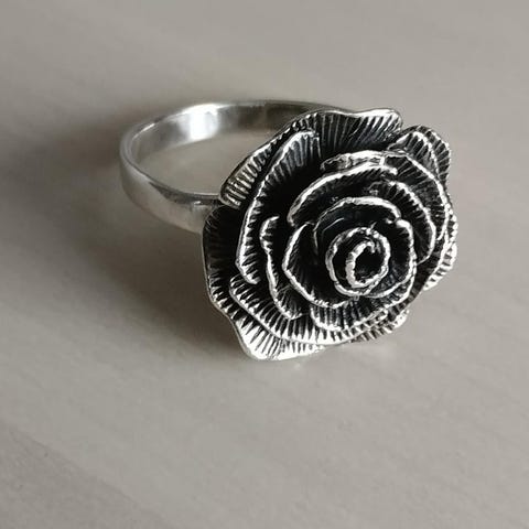 Ruususormus , ruusu 6 mm, sormuksen lev. 3 mm, ontto reikäkuvioitu, leimat SPJ 925, halk. 17,5 hopeaa, h. 20 €. + pk 2,75