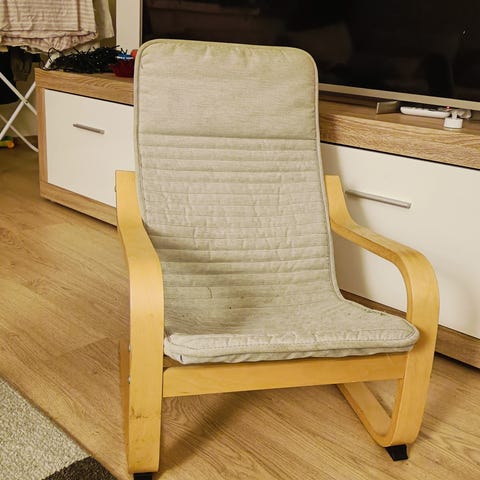 IKEA lasten nojatuoli, vaalea kangasverhoilu ja puinen runko. Kissatalous. Vain noudolla.