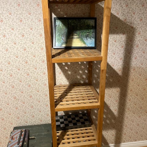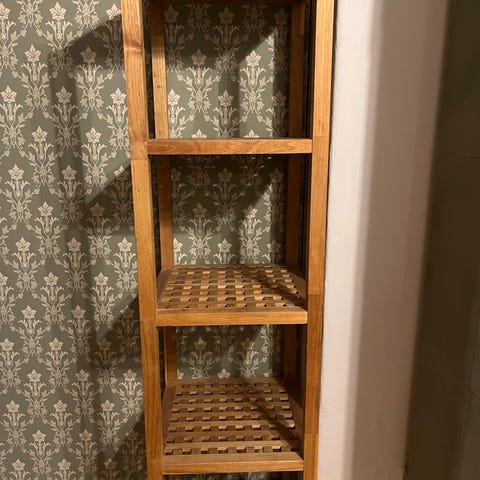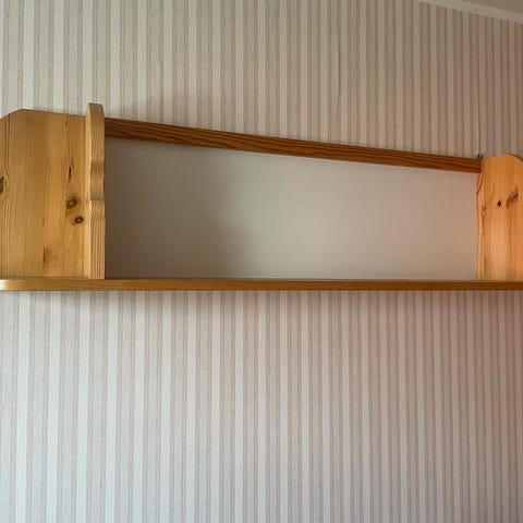 Puinen seinähylly joka voidaan asentaa sängynpäätyyn. Antaa hyvin lisätilaa kirjoille yms sängyn päädyssä. Kaapit (leveys 36cm) molemmilla puolilla. Sängynpäädyssä myös n.20cm laskutilaa. Kaappien väliin jäävän tilan leveys on 180cm. Hylly on valmistettu 1970 luvulla mittojen mukaan 20mm tammiviilutetusta vanerista.
