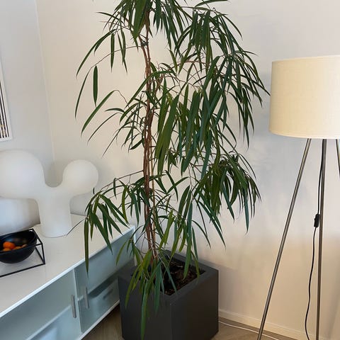 Kumiviikuna huonekasvi. Kasvi on istutettu valkoiseen ruukkuun. Pidetty huolta ja vaihdettu multaa. Korkeus n. 150cm.