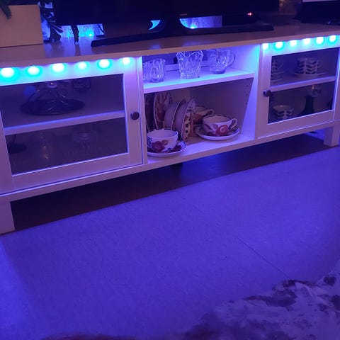 Tyylikäs valkoinen TV-taso kahdella vetolaatikolla ja avohyllyillä. Hyvin säilytystilaa elektroniikalle ja tarvikkeille.