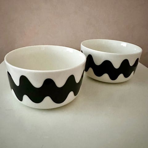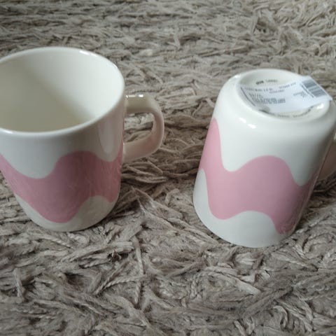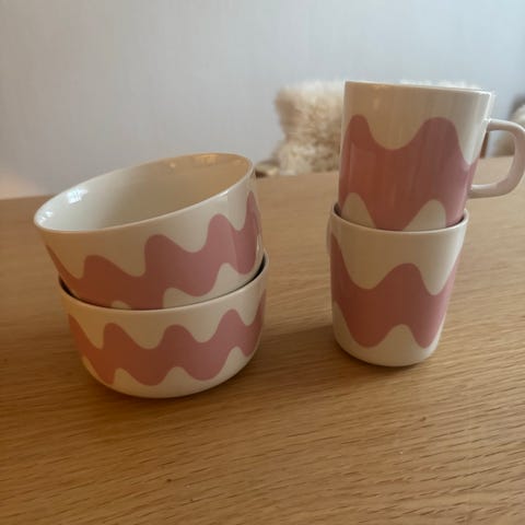 Uusi/uudenveroinen. Laput poistettu mutta osaa ei käytetty. Marimekko astiastosetti, jossa 2 lautasta, 2 kulhoa ja 2 mukia. Valkoiselle pohjalle painettu vaaleanpunainen aaltokuvio. Sopii arki- ja kattauskäyttöön esimerkiksi ruoka-, jälkiruoka- ja kahviastiastoksi. Materiaalina lasitettu keramiikka/posliini, joka kestää tavanomaisen keittiökäytön.