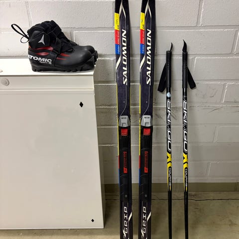 Sukset 130 cm Atomic sns - profiilin siteellä, sauvat Apollo Rex 100 cm. Monot Salomon koko 33. Monoiksi voi vaihtoehtoisesti ottaa koon 31,5 tai 34 / 35 monot.