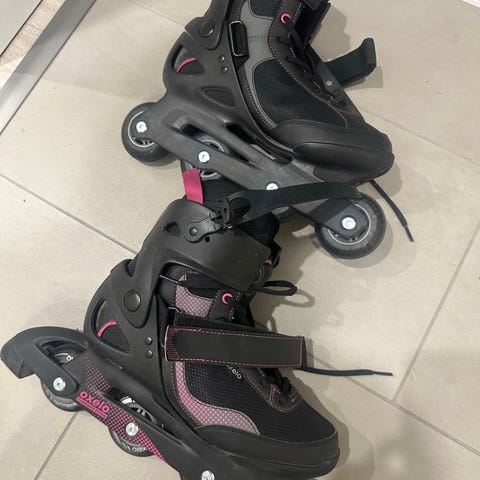 Nike Air inline-rullaluistimet. Koko 38 EU sopii arviolta noin . Väri harmaa ja musta, yksityiskohtina keltaista. Luistimissa on nauhakiinnitys sekä tarranauha nilkan tukena. Neljän renkaan alumiini- tai komposiittirunko, jarrupala takana toisessa luistimessa. Soveltuvat vapaa-ajan rullaluisteluun tasaisilla alustoilla.