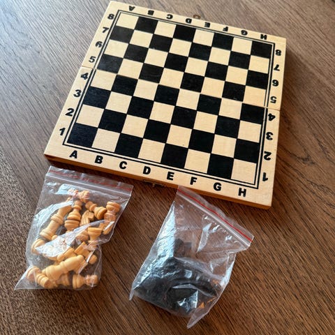 Shakkipeli, jossa muoviset mustat ja valkoiset nappulat sekä rullattava pelilauta. Ylimääräiset kuningattaret.