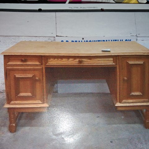 Puinen kirjoituspöytä, jossa suorakaiteen muotoinen pöytätaso ja lämminsävyinen puupinta. Toisella sivulla on viisi vetolaatikkoa. Vastakkaisella sivulla on avoin hyllyosa kahdella hyllytasolla esimerkiksi kirjoille tai kansioille.