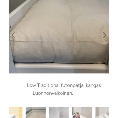 Futonnetistä ostettu 180x200cm futonpatja Comfort, sänkyrunko Elan ja Top cover cotton petauspatja. Hinta oli uutena yli tuhat euroa, nyt 500e. Hyvässä kunnossa. Myydään ensisijaisesti pakettina.