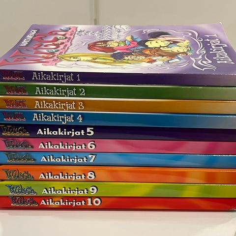 W.i.t.c.h. -kirjasarja, suomenkieliset nidotut kirjat. Kuvissa näkyvät osat Aikakirjat 1, Aikakirjat 2, Aikakirjat 5 sekä kirjat Yön kuningatar ja Taikaruusun maa. Kirjat kuuluvat nuorille suunnattuun fantasia- ja seikkailusarjaan. Sopii luettavaksi alakouluikäisille ja sitä vanhemmille nuorille, jotka pitävät fantasiasta ja sarjakuvamaailmoista.