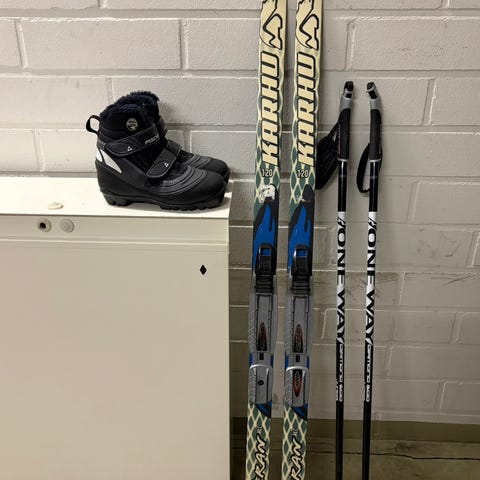 Lasten suksipaketti ( sukset 120 cm,+monot 32( 20 cm)+ sauvat 85 cm.)