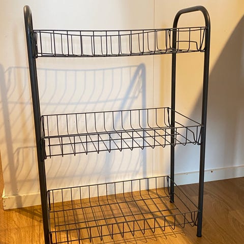 Beigen värinen muovinen kolmikerroksinen hylly. Sopii kylpyhuoneeseen tai muuhun käyttöön. Erittäin kevyt ja erinomaisessa kunnossa ilman vaurioita. Sopii mihin tahansa sisustukseen ja on erittäin kompakti.
