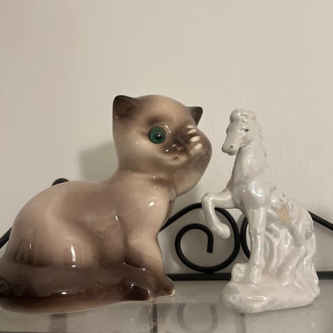 Keraaminen hiiriperhe-koristefiguuri, jossa yksi isompi hiiri ja kaksi pienempää hiirtä metalliketjulla yhdistettynä. Väri on pääosin valkoinen, yksityiskohtina vaaleita ja tummempia sävyjä. Sopii sisustuselementiksi hyllylle, lipaston päälle tai muuhun esillepanoon. Materiaali on kovaa keramiikkaa tai posliinia, ja figuurit seisovat omalla jalustallaan yhtenä kokonaisuutena.
