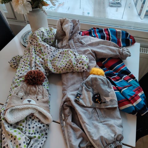 Kuvien vauvan vaatteet ja hoitolaukku. Käytön jälkiä osassa ja osa uudenveroisia. Koot 56-74 ulkohaalarit kokoa 56-62.