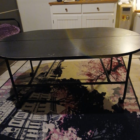 Pöytä on ostettu n. 2 vuotta sitten Jyskistä aletuotteena keinuvan jalan vuoksi. On toiminut oikein hyvin mutta hieman keikkuva.
