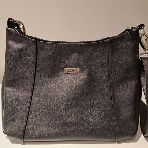 Syvän tummanpunainen käyttämättä jäänyt olkalaukku. Leveys 34 cm, korkeus 25 cm ja syvyys 12 cm. Pehmeää, tukevaa keinonahkaa. Vuori on ruskeaa kangasta, sisällä 3 taskua, josta yhdessä vetoketju. Merkki on Nabo.
