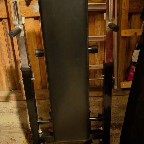 Hyväkuntoinen Gorilla Sports painonnostopenkkisarja, johon kuuluu säädettävä painonnostopenkki (jossa pientä kulumaa), kaksi säädettävää kyykkytelinettä, metalliset painotangot sekä itse levypainot.