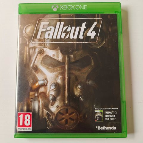 Bethesda Fallout 4 Xbox One -peli. Fyysinen levy Xbox One -konsolille vihreässä kotelossa. Ikäraja PEGI 18. Mukana kotelo ja pelilevy, kuvissa myös Season Pass -esite.