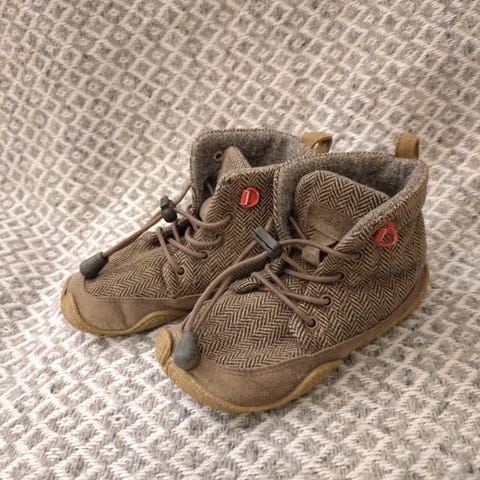 Vuorelliset Paljasjalkakengät villavuorella koko 25 kärki hieman irvistää toisessa, ei haittaa käyttöä, näppärä vaikka liimaa. Ihanan letkeät Paljasjalkakengät