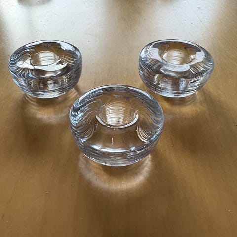 2 kappaletta. Alkuperäispakkauksessa. Suunnittelija: Tappio Wirkkala. Lasia. Viimeisessä kuvassa näkyy, että yhdessä kynttilänjalassa on pieni tumma värimuutos, joka ei näy käytössä.