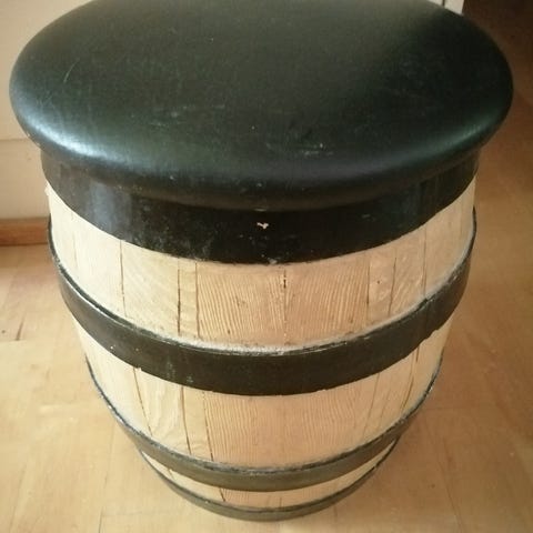 Korkea valkoinen jakkara, jakkaran pinta halkeillut kahdesta kohtaa, muutoin hyväkuntoinen.