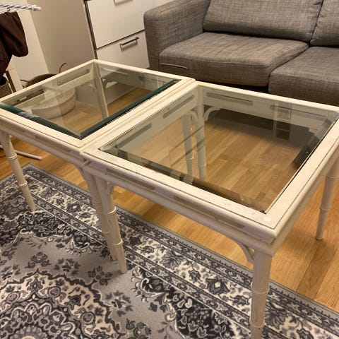Pöydän päällä ollut lasilevy, 2 kulmaa pyöristetty.