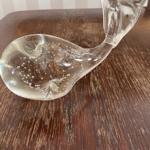 Lasinen riippukoriste, jossa kirkas, särölasimainen kupu ja metallinen kiinnike. Valaisimessa on tumma metalliketju ja koukku ripustamista varten.