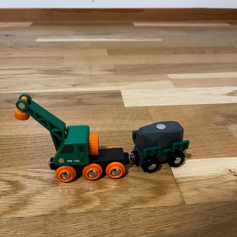 Brio crane train set, 33162. Note: one wagon is missing. Used; minor signs of use can be found. For example, few small paint stains on wooden pieces (circled in the picture). Otherwise in good condition. 7 wooden rail pieces included. Fits perfectly with other Brio trains. Non-smoking household. Pick up from Kivistö / shipping with ToriDiili.