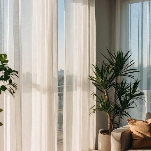 Ruosteenoranssi verho on ohuempi valoverho. Vaaleanpunainen kiiltäväpintainen verho on osittain pimentävä.