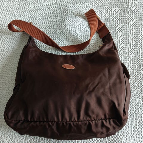 Longchampin hyvässä käytetyssä kunnossa oleva näppärän kokoinen olkalaukku. Laukku on valmistettu synteettisestä materiaalista ja siinä on säädettävä olkahihna. Ulkopuolella on pieni läppätasku kännykälle. Neutraali, maanläheinen vihertävä khaki sävy.