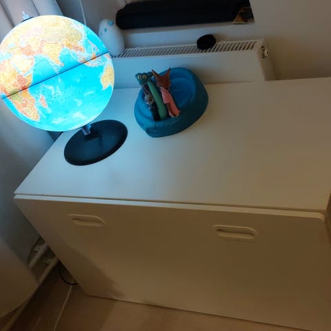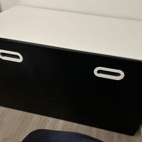 IKEA Småstad säilytyslaatikko, väri valkoinen. Tukeva kansiosa, jota voi käyttää myös penkkinä ja iso laatikko pyörillä.