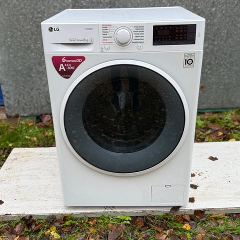 LG edestä täytettävä pesukone. Väri valkoinen, etuluukku tummennettua lasia.
